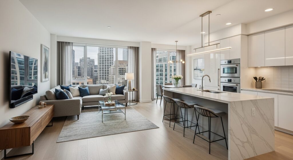 עיצוב סלון עם מטבח פתוח כגישה תכנונית מודרנית
