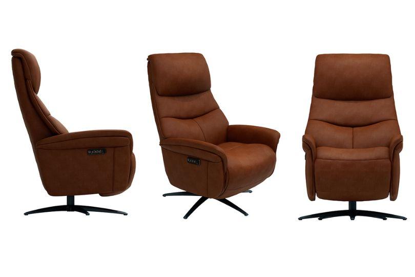 כורסא מעור בעלת ריקליינר חשמלי לפתיחה עד מצב שכיבה עם מנוע חשמלי כפול ומנגנון סיבוב, ריפוד: 100% עור במגוון צבעים לבחירה, מבנה: עץ מלא מחוזק סיבית, חיזוק: רצועות אלסטיות שזורות, מילוי: לאטקס ופוליאוריתן מוקצף, ניתן להזמין את הכורסא גם בבד. בסיס מתכת מסתובב, מחוזק ברצועות אלסטיות להתנגדות גבוהה.כורסה עור עם ריקליינר חשמלי מנוע כפול: רוחב: 76 ס"מ גובה: 1.12 מטר עומק מושב: 89 ס"מ מבנה: עץ אורן מלאצבעי עור
