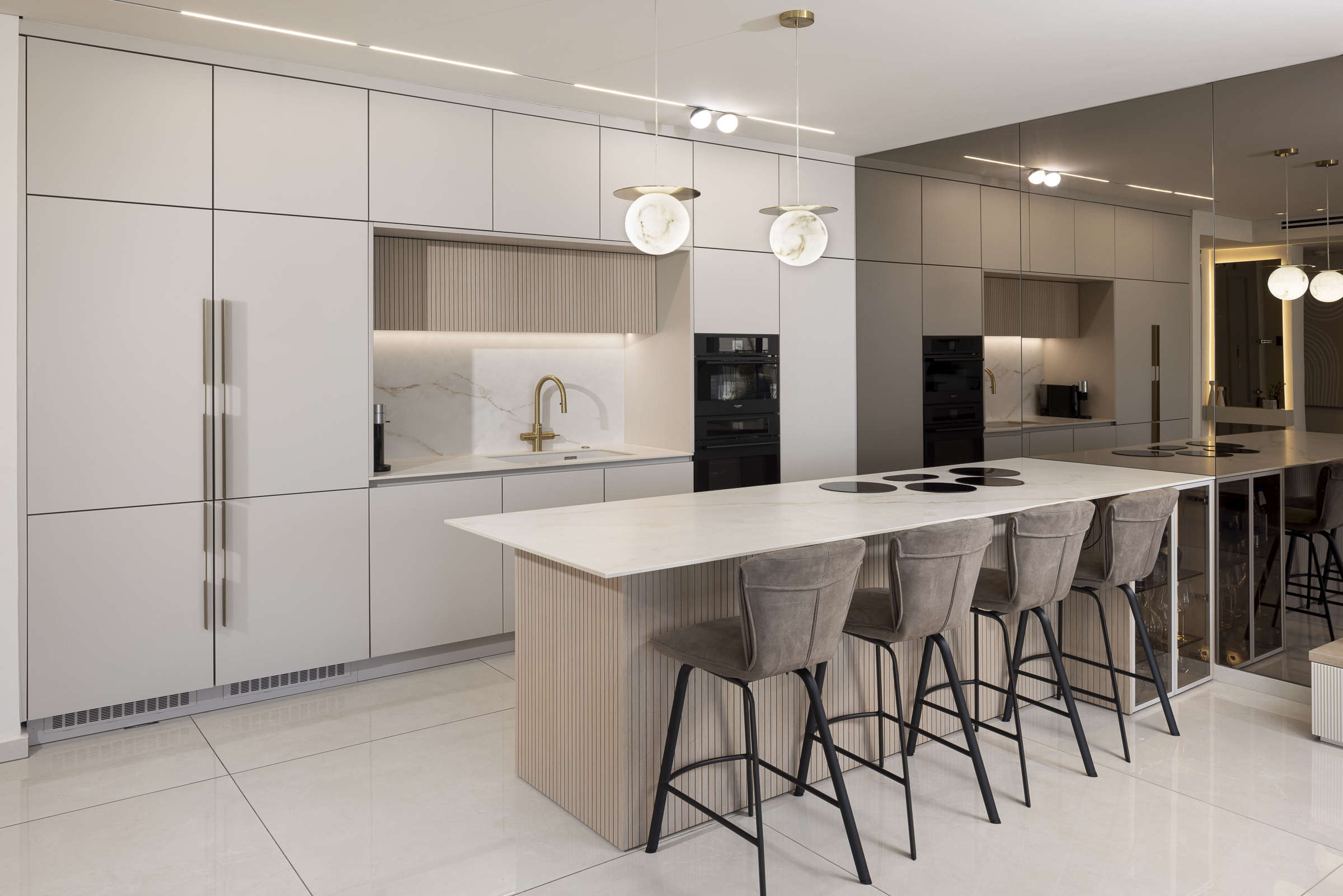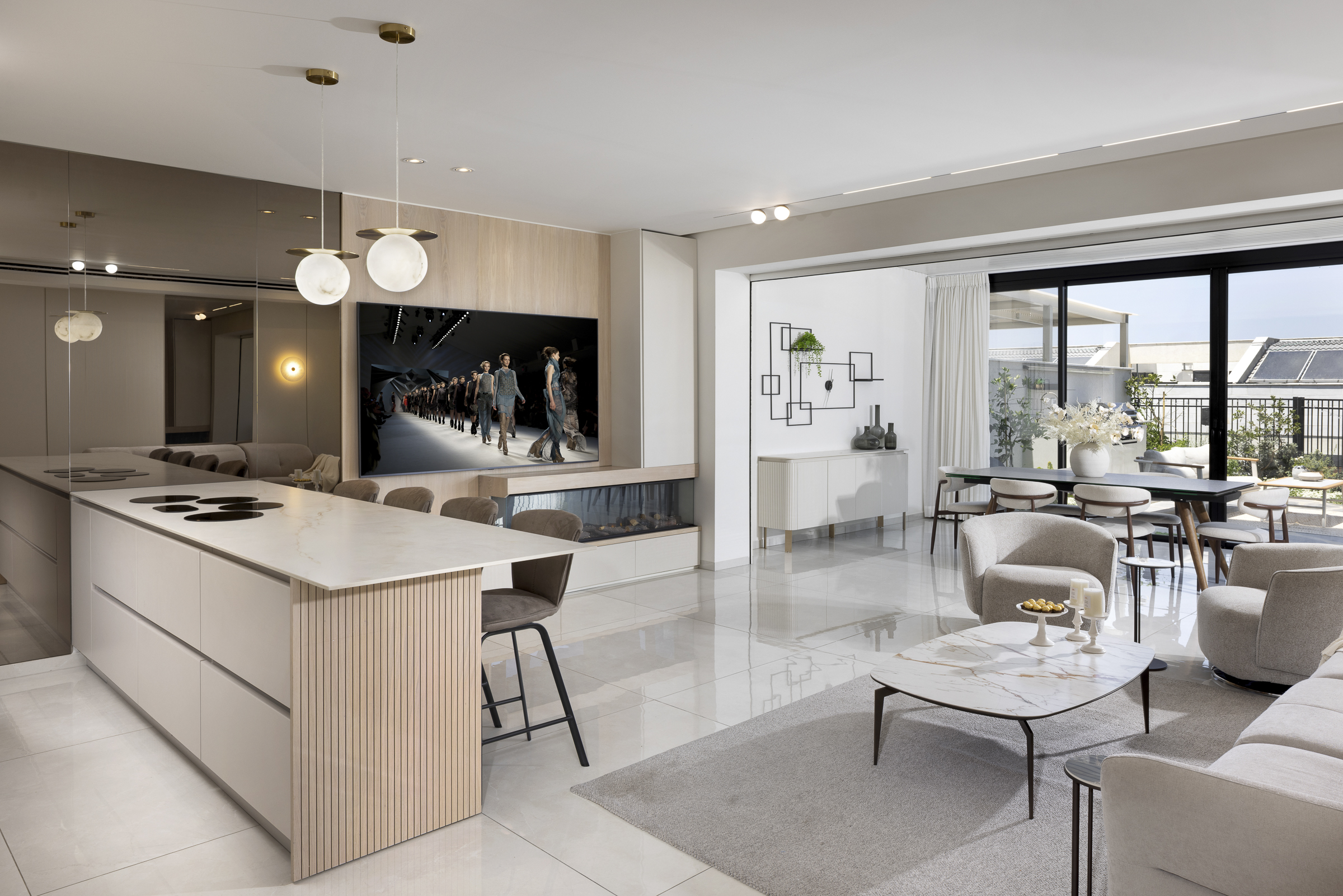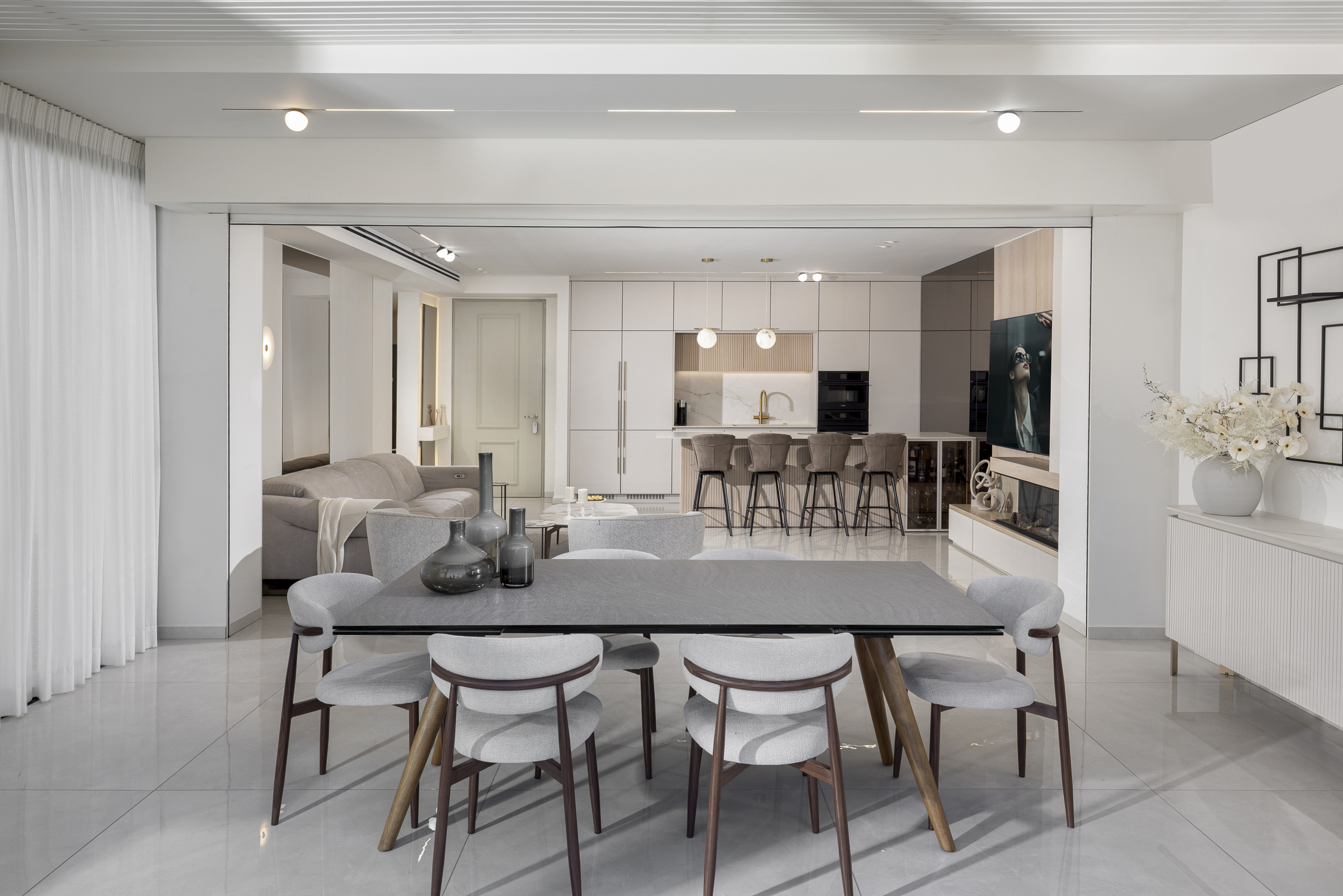 החללים נבנו בקווים נקיים , חומריות מחבקת ותכנון מוקפד המשלב בין פונקציונליות לאסתטיקה . המטרה שלנו הייתה ליצור בית שקט, אלגנטי, מלא אור , עם תחושה של איזון בכל פינה. המטבח והסלון הוא לב הבית ובו שילבנו את המוצרים של דיבאני סנטר - מפגש של פונקציונליות וסטייל. שילוב מדויק של חומרים טבעיים, גוונים רגועים ואור שמש שנכנס בשפע.